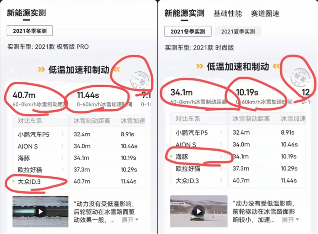 明显 “海豚” 的制动距离和加速时间都要好过 “大众 ID.3”,怎么会出现如此颠倒黑白的评价呢?欺负用户不会对比着看吗?