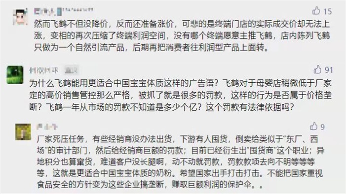 同时,消费者和从业者对飞鹤的质疑也从未消停过,“章子怡的小孩真的喝飞鹤吗?”“奶粉卖到全球第一贵,是智商税吧?”“钱都让厂家赚走了,门店赚不到钱”。