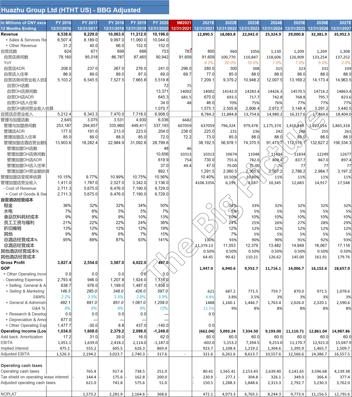 比如 2021 年截止到 10 月底总共新开店 1185 间,若全年开店 1400 间,新增客房 14 万来算,这个总数对比 2020 年底 65 万间,增速是 21.5%。今年内地被疫情影响开店仅 8 月及 10 月两个月,各自影响了约 80 家酒店,对总体新开店增速影响不大。预测期内用从 23% 开始,逐步降至 20% 的客房数增速。