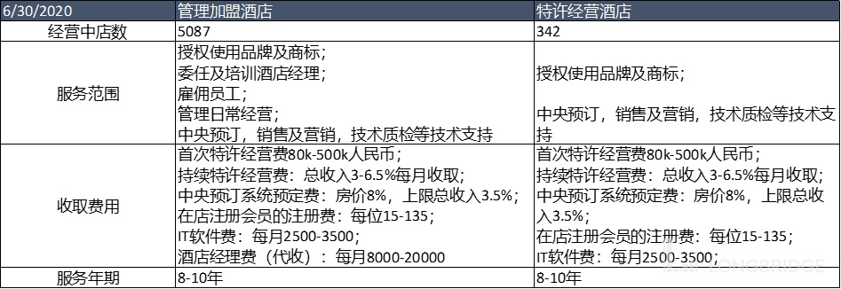 上表详列的华住的管理加盟和特许经营模式对比。虽说理论上管理加盟与特许经营有根本上的不同:管理加盟是全面管理店面而特许经营只是收个加盟费。但实际上区别并不大。因为两者的有效收入是一样的,都来自于浮动的抽点和固定的软件费。人工相关费用不论是酒店经理还是一般雇员都是一个代收性质。各项店面的费用其实本质与租金一样都是业主方从时候入中拿出一部分来支出,与华住品牌方无关。当然所有装修费用也都是业主方来出,品牌只提供规格要求。