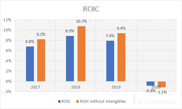 上面两图是过去 4 年的公司 ROIC 和自由现金流状况。需要提出我用的资本投入总额是包括经营性租赁(operating lease assets)的。之前我的专栏没有特别提到:会计准则要求 2019 年年报开始公司需要将经营性租赁资本化,反映在资产负债表中,一般在资产端直接并入物业厂房设备项下(PP&E),而负债端基本等值计入。 尤其对于酒店这种业务性质,十年以上长租与持有物业每有本质分别,将租金资本化是合适的做法。另外,大型酒店集团在逼近 100 万间客房的规模一般都会有并购产生(万豪,锦江均是如此),所以无形资产比如商誉也应该计入投入资本。两者纳入计算后,可以发现在正常年景,华住的 ROIC 都无法超过 10%。在我们看过的公司中属于偏低水平。而自由现金流更是非常的薄。2019 年仅产生 15.29 亿人民币。