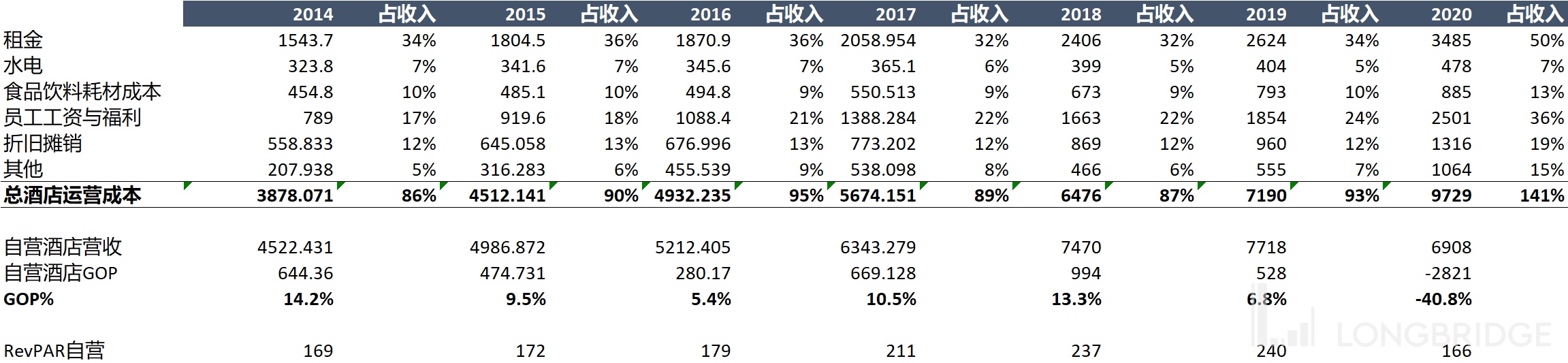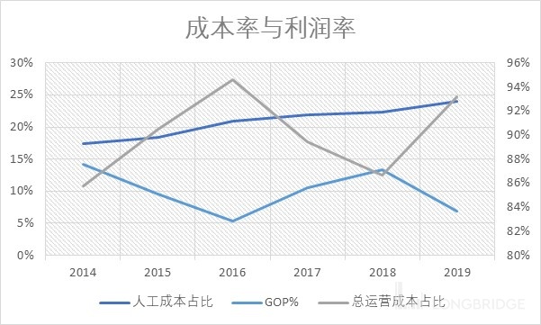 传统酒店有一项经营指标叫做 GOP,gross operating profit,相当于其他行业公司的毛利。即酒店营业额扣除酒店运营开支(四面墙内成本)的利润。