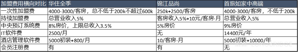 上表显示这几大收入类别中,一次性加盟费三大酒店品牌并无区别(每店平均 100 间客房),中值在 50 万元左右。持续加盟费也无区别:营业额的 5% 或客房收入 5%+1000。