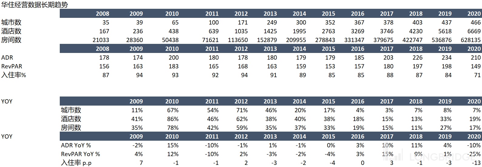 酒店总收入=酒店总数 * 每个酒店客房数 * 入住率 *ADR,可以分成这四个元素来分析。在拍未来这四个元素的增长之前,我们看看历史上这几个元素是如何增长的: