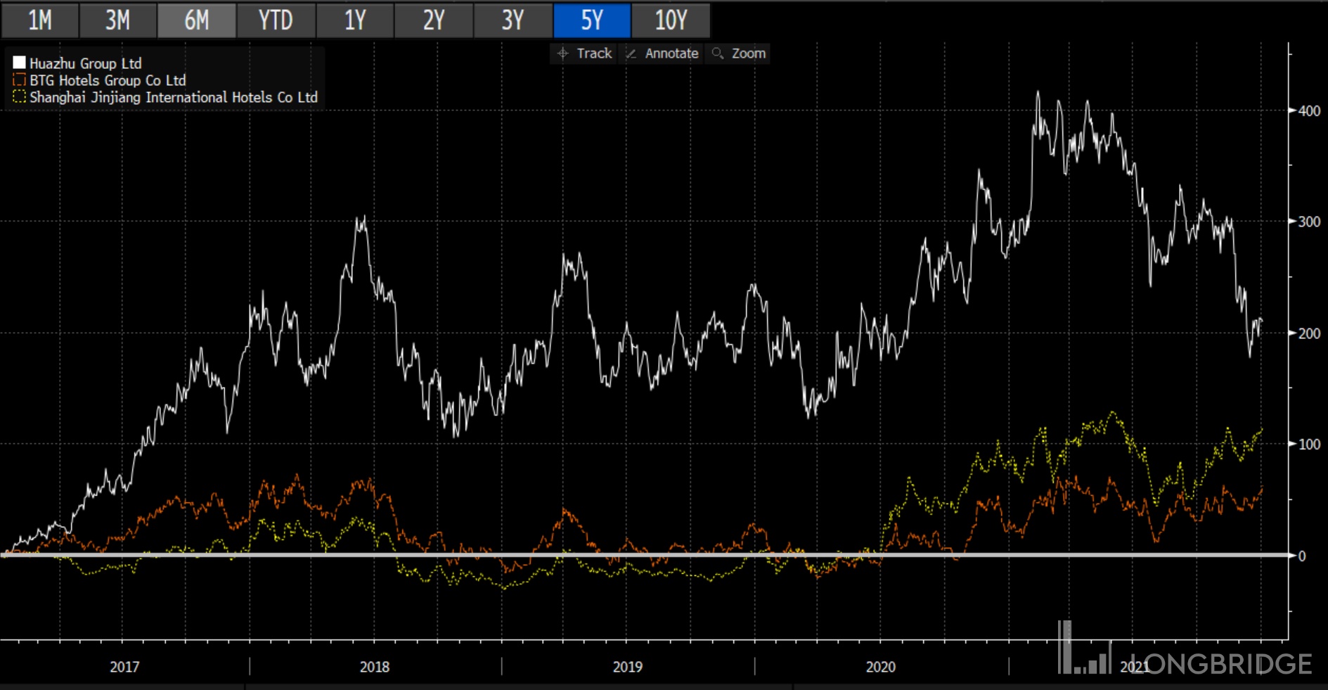 中国连锁酒店业三巨头:华住$H World(HTHT.US)$HWORLD-S(01179.HK) ,锦江和首旅。锦江酒店(A 股$JINJIANG HOTELS(600754.SH) 600754)和首旅如家(A 股$BTG Hotels(600258.SH) 600258)的一年期表现分别是 18.85% 和 29.03%,对比华住-20.73%,两年期走势锦江 +113.58%,首旅 +34.35%,而华住仅-8.25%。而五年的表现分别是华住 209.43%,锦江 114.66%,首旅 62.18%,分化明显。长短期股价分化非常明确。看一年期股价表现首旅>锦江>>华住,而长期股价华住>锦江>>首旅:完全相反。到底长短期股价谁正确?我们本篇以华住为基,来认真分析一下。