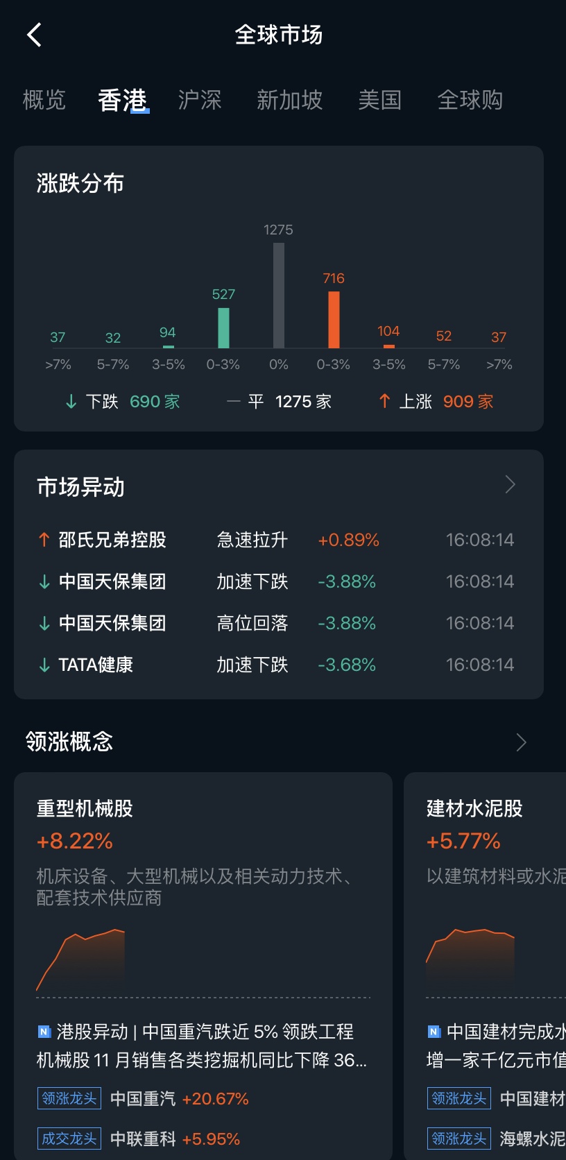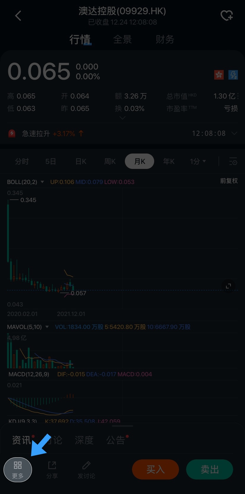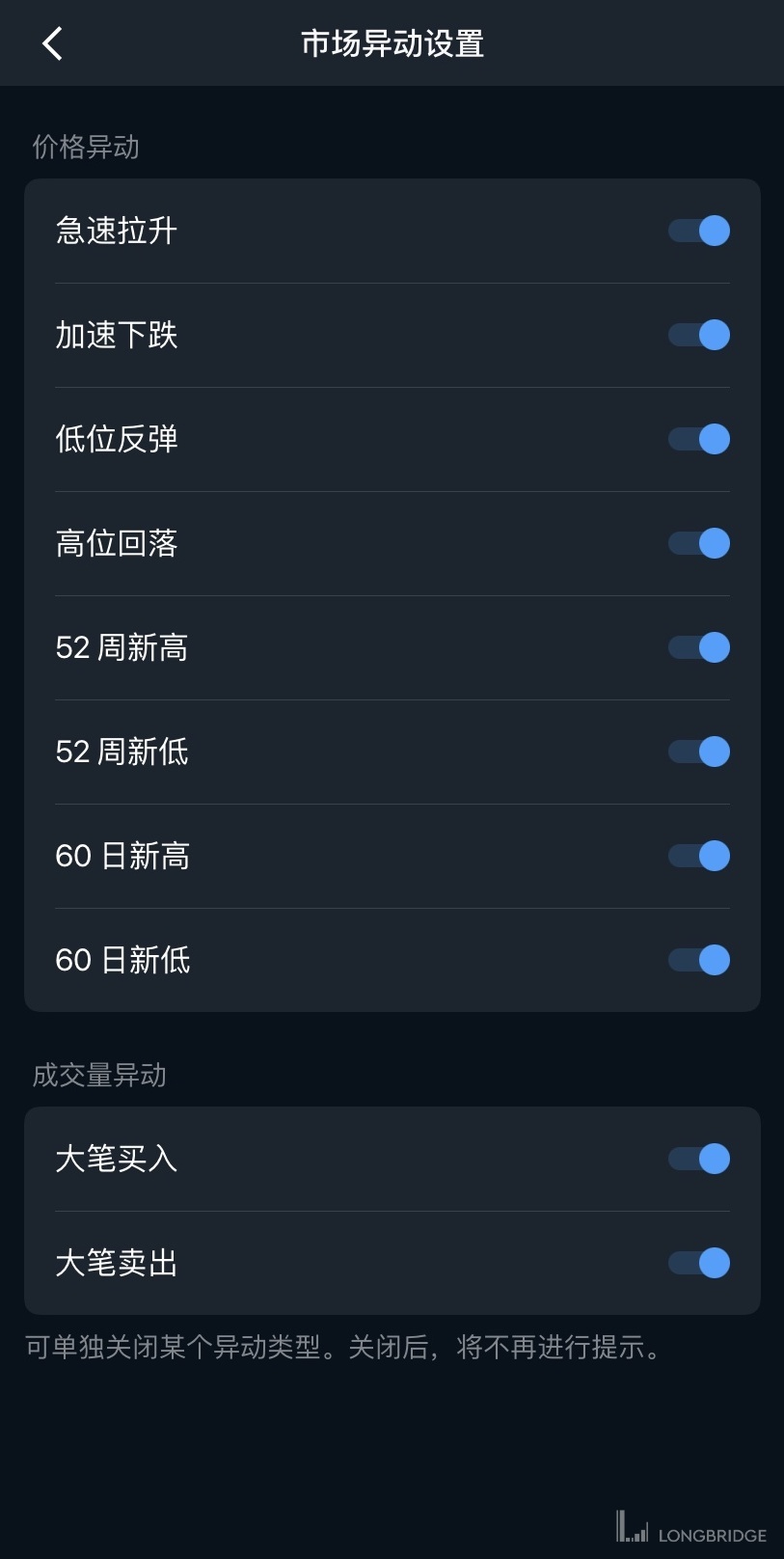 2.市场异动:异动是针对盘中股价、成交量的监控,你可以在市场 - 全球市场频道内查看,也可以在个股详情页定制异动提醒,精准出击。长桥支持急速拉升、加速下跌、低位反弹、大笔买入卖出、52 周内新高新低、60 日内新高新低共 10 类异动情况