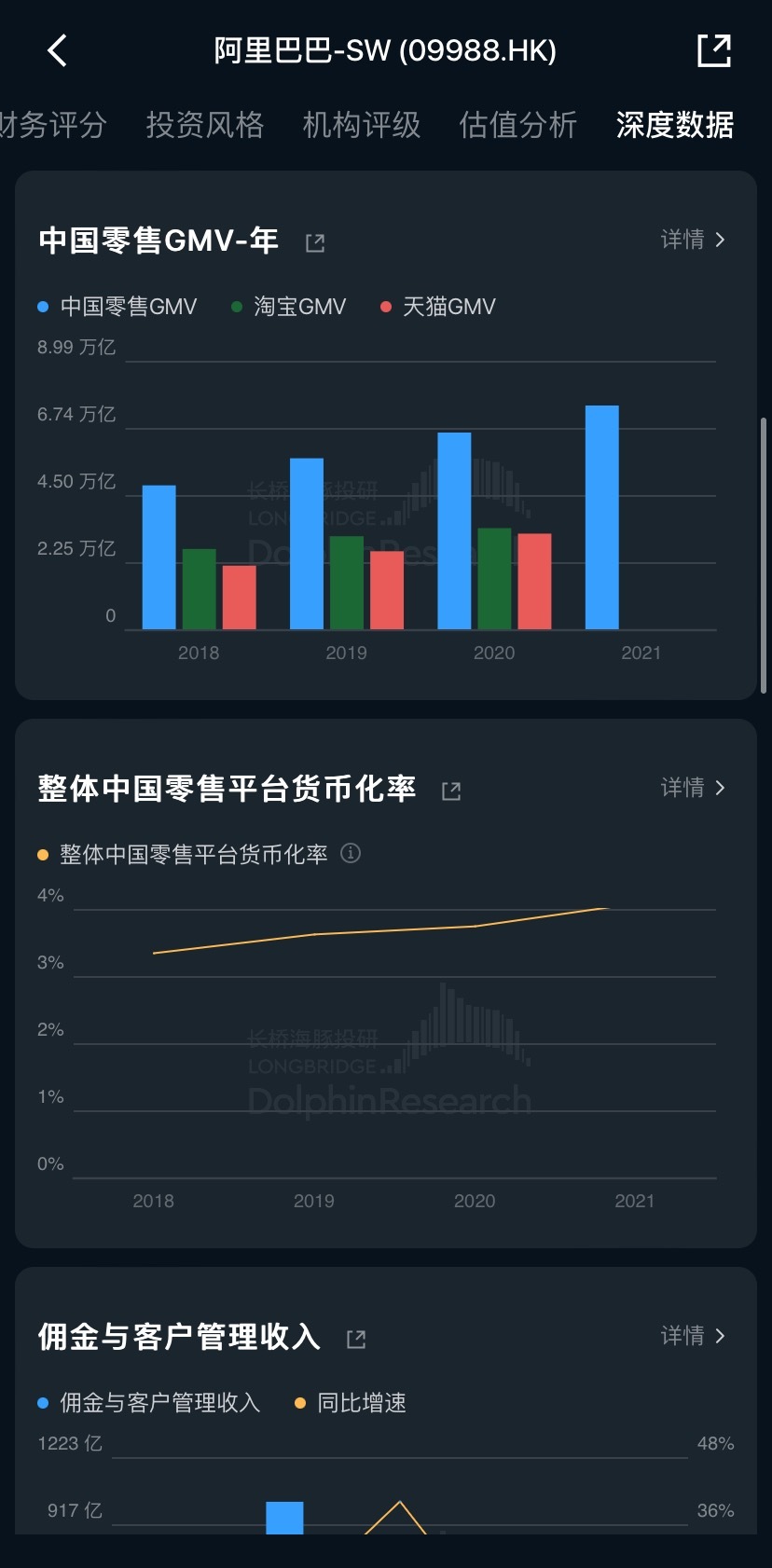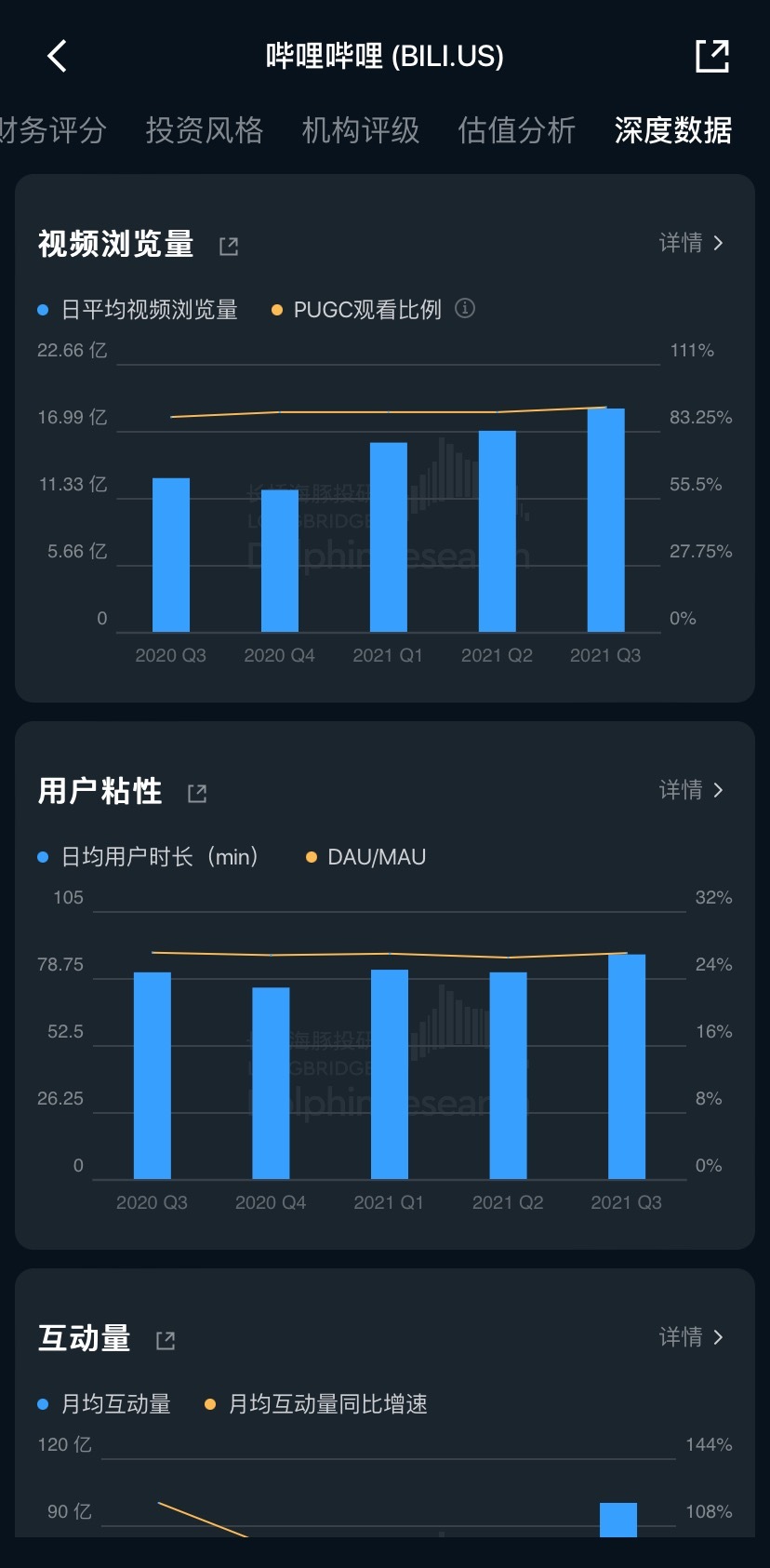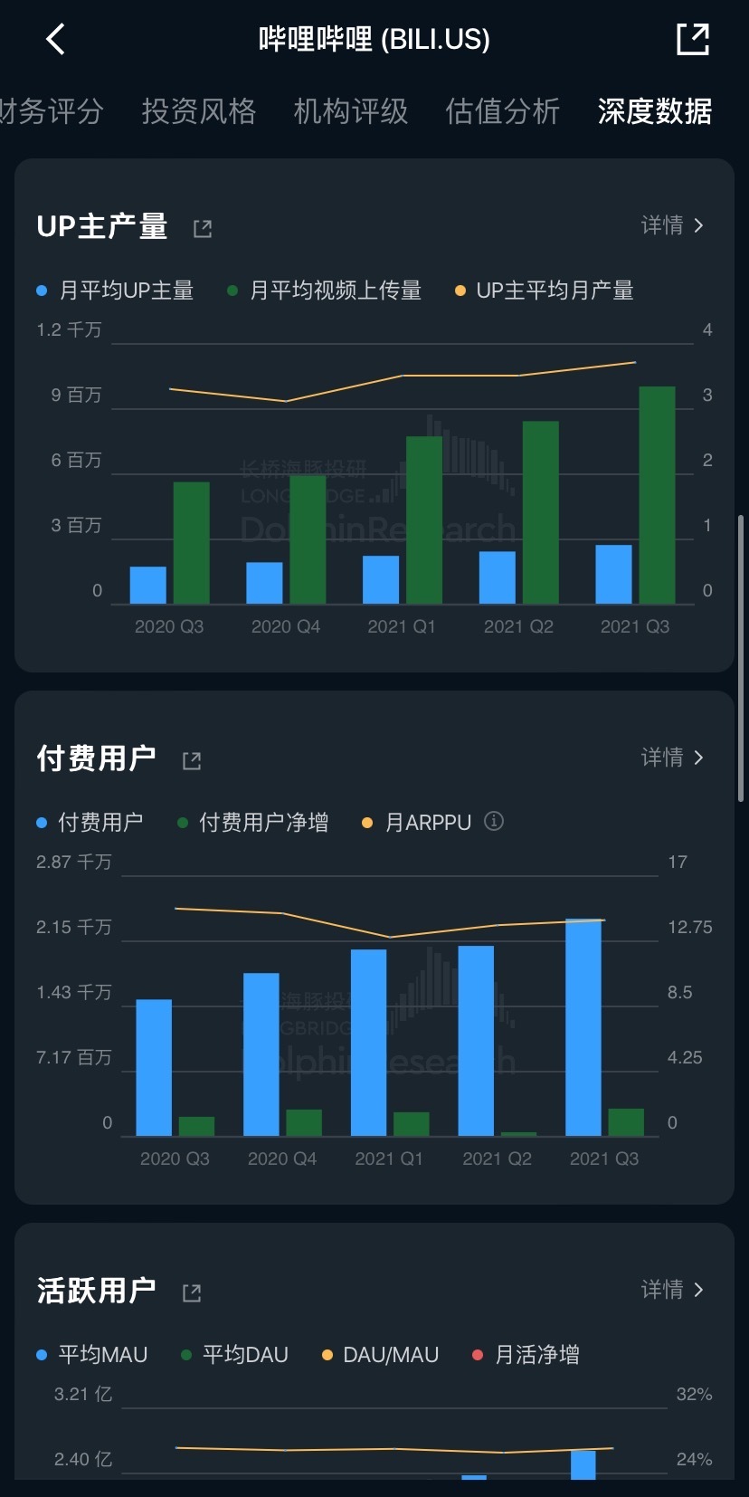 - 长桥特别提供 全景-深度数据 功能:针对不同个股,从财报中挑选不同关键指标,如 b 站的 up 主产量、日均用户时长,阿里的云计算营收、天猫 GMV 等用户数据,汇集起来,供你轻松查看,对个股具体状况有针对性的了解