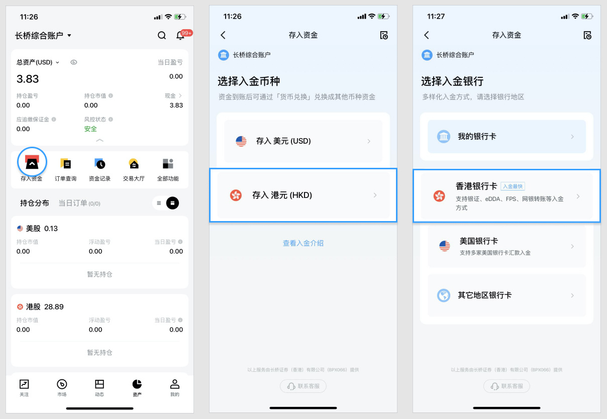 1、选择「资产」tab-「存入资金」-「存入港元」-「香港银行卡」