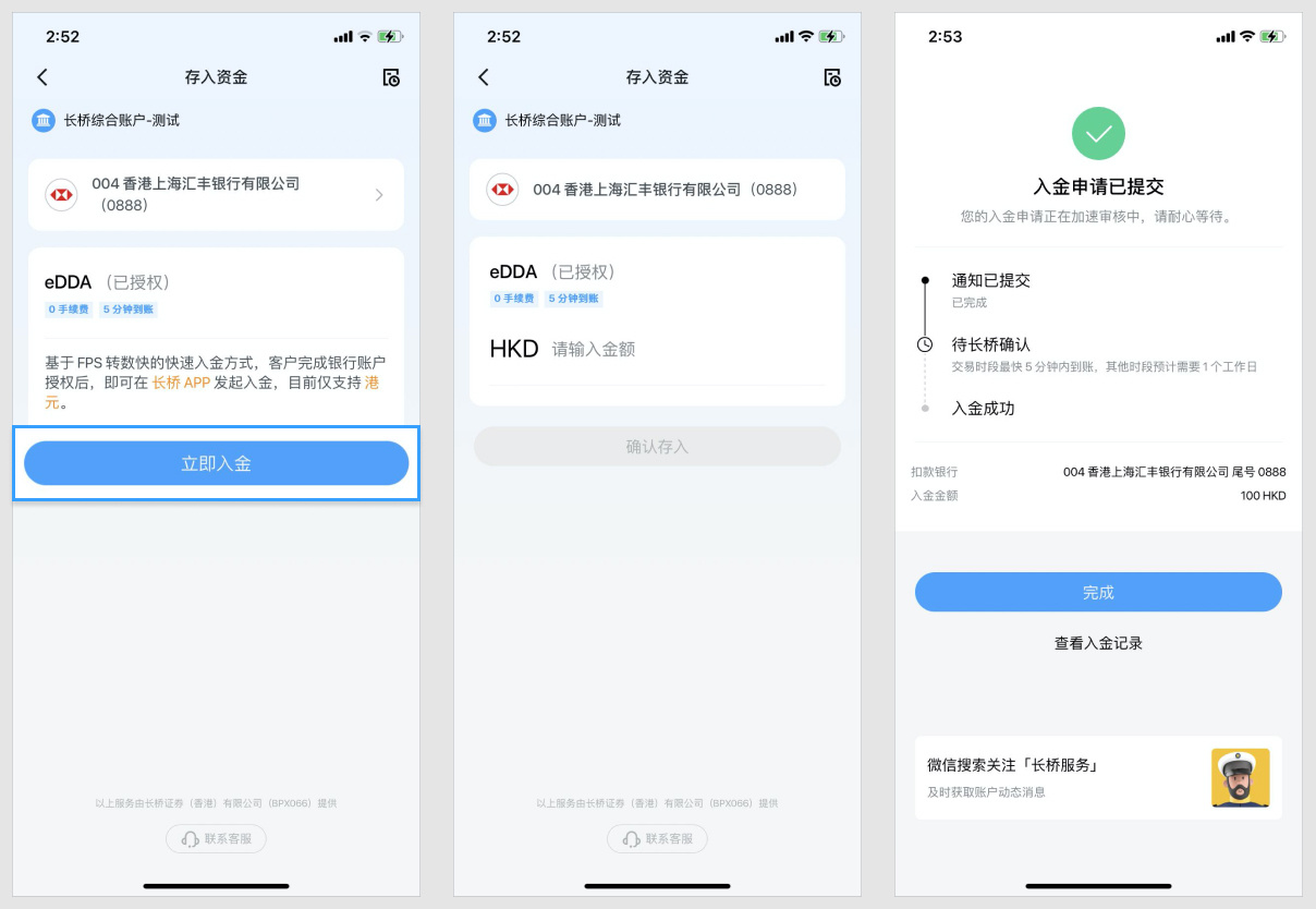 到这里 eDDA 入金就完成啦~,后续呢就不用再申请授权,直接选择 eDDA 入金即可,方便快捷。入金成功后,即可开启您的投资之旅。