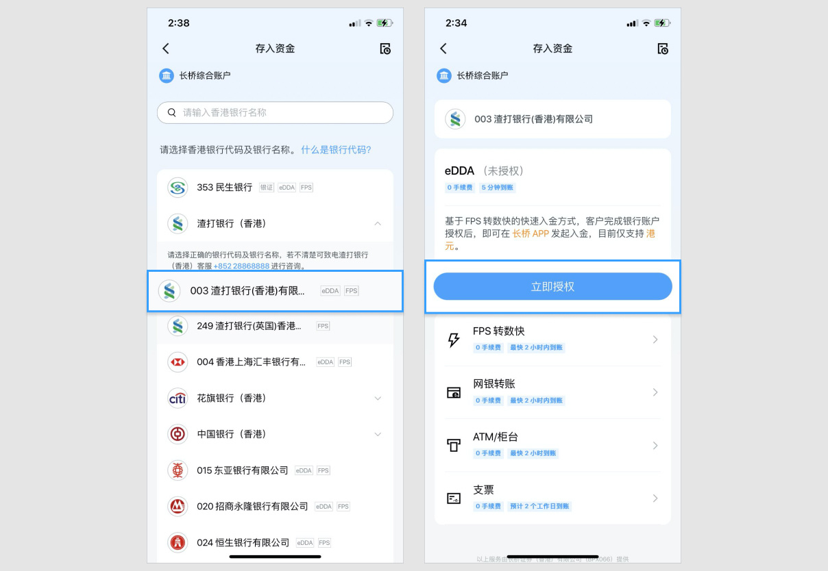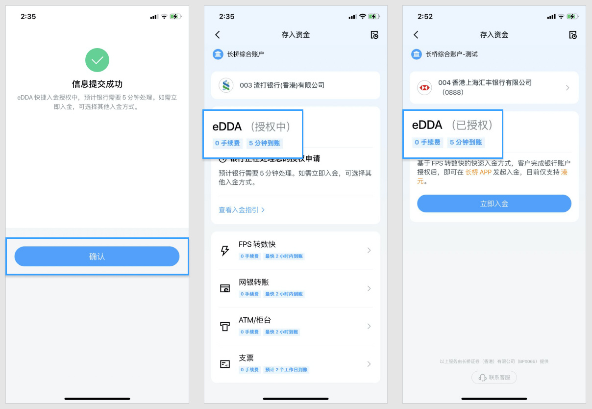 eDDA 快捷入金直接扣款授权是香港金管局推出的 FPS 转数快系统增值服务,支持客户授权长桥证券从指定银行账户将资金存入证券账户。