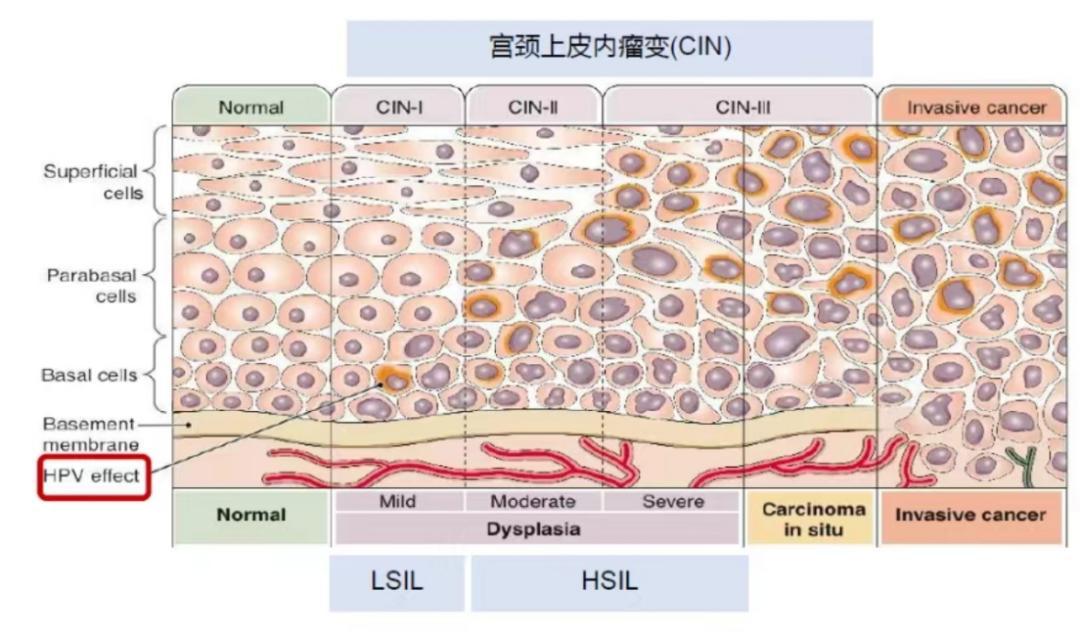 宫颈癌前病变,又被称为宫颈上皮内瘤变(CIN),主要是因为 HPV 病毒感染所致,诱使宫颈上皮组织出现一些异变细胞。随着异变细胞数量的增多,CIN 阶段逐渐加重,直至发展成为浸润性宫颈癌。