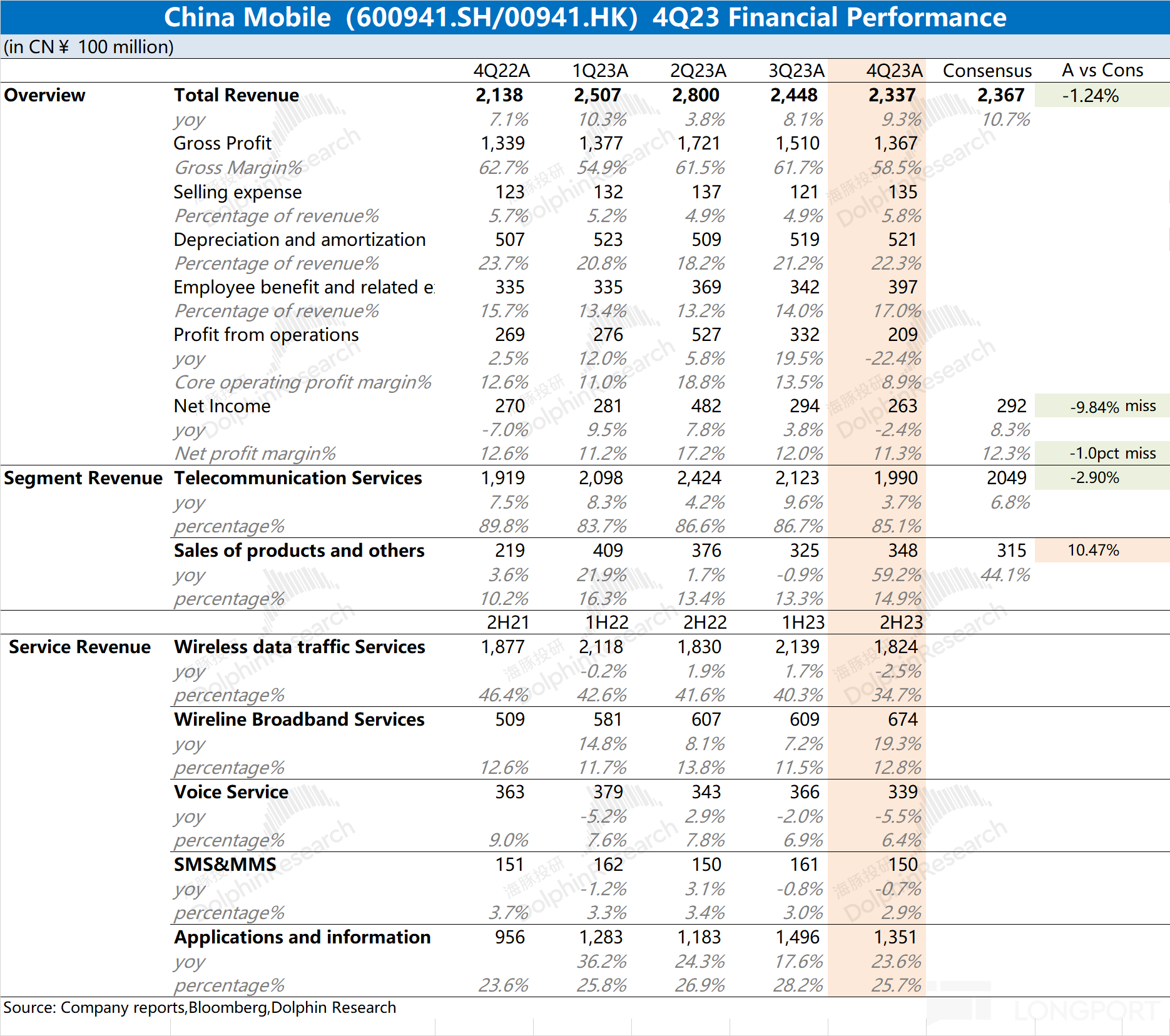 CHINA MOBILE (600941.SH/00941.HK) released its 2023 fourth quarter financial report after the Hong Kong stock market closed on the evening of March 21, 2024 Beijing time, with the following key points: