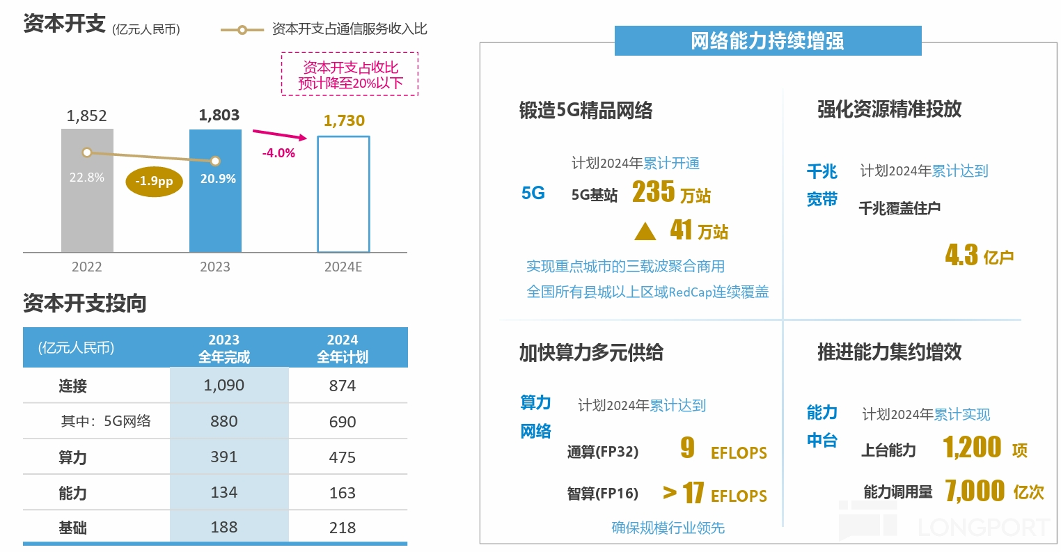 1) Capital Expenditure: In 2023, capital expenditure amounted to RMB 180.3 billion, accounting for a decrease of 1.9 percentage points in proportion to telecom service revenue, at 20.9%. The company expects capital expenditure in 2024 to be around RMB 173 billion, a decrease of 4.0% from 2023, with capital expenditure as a percentage of revenue expected to drop below 20%. By the end of this year, the company plans to have opened 2.35 million 5G base stations and achieve a smart computing scale exceeding 17 EFLOPS;