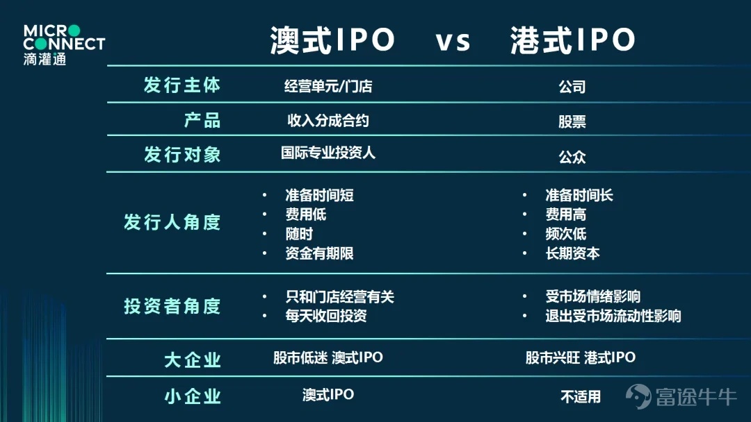 First, the issuing entities and products are vastly different. Hong Kong-style IPOs are issued by companies, with stocks as the product; Australian-style IPOs can be issued by single stores or business units, with revenue-sharing contracts as the product. Additionally, Hong Kong-style IPOs target the general public, while Australian-style IPOs focus on international professional investors—ordinary people can’t invest.