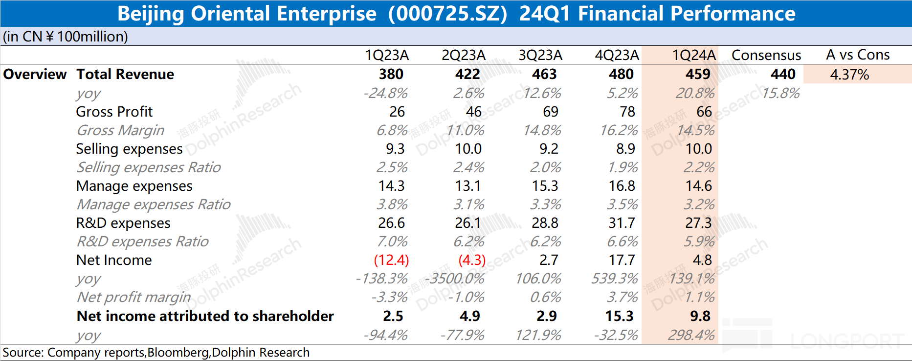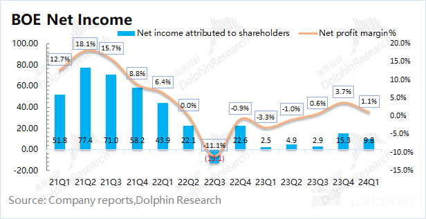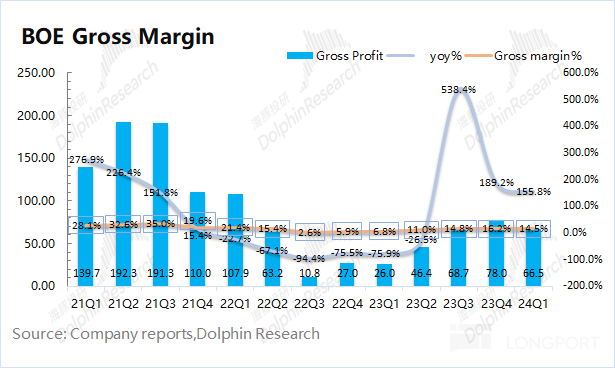 BOE achieved a gross profit of 6.65 billion yuan in the first quarter of 2024, a year-on-year increase of 155.8%. The gross profit margin for this quarter was 14.5%, an increase of 7.7 percentage points year-on-year. The year-on-year increase in gross profit margin this quarter is mainly due to the rise in panel prices. The current level of gross profit margin has brought the company's profit back above the breakeven line.
