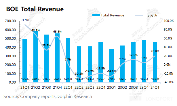 BOE's total revenue in the first quarter of 2024 was 458.9 billion RMB, a year-on-year increase of 20.8%, exceeding market expectations (440 billion RMB). The company's quarterly revenue has exceeded 45 billion for three consecutive quarters, indicating that it has emerged from the bottom The company's current revenue growth is mainly driven by price increases. Revenue in the current quarter increased by 20.8% year-on-year, and the prices of large panels of all sizes in the first quarter compared to last year also increased by more than 20%.