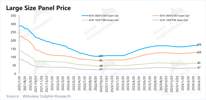 According to Witsview's late April pricing, the prices for 65-inch/55-inch/43-inch/32-inch panels are $176/$129/$65/$37 respectively. Although panel prices stagnated earlier this year, prices started rising again in March. Prices for panels of various sizes have risen by more than 35% from the bottom.