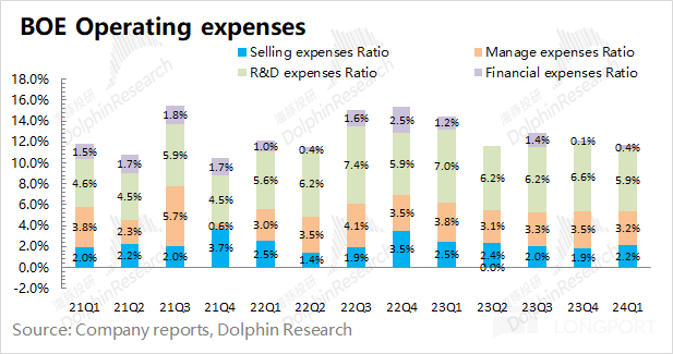 In the first quarter of 2024, BOE's total expenses amounted to 5.816 billion yuan, a year-on-year decrease of 17.2%. The expense ratio was 12.1%. Both sales expenses and financial expenses declined this quarter.