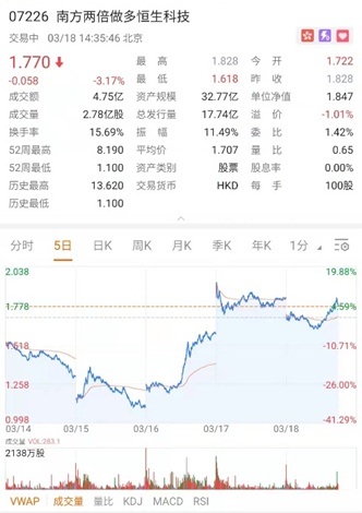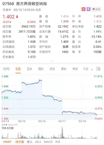 就拿近期市场举例来说,2 月 23 日,南方东英纳斯达克 100 指数每日反向(-2x)产品($FI2CSOPNASDAQ(7568.HK))的基金单位价格只有 1.4 港元左右,但若投资者当时望而却步,就错失了 2 月 24 日近 13% 的单日回报。
