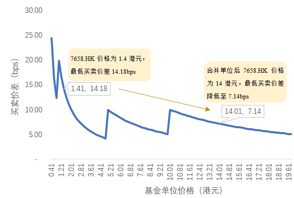 而合并基金单位生效之后,10 个现有基金单位合并为 1 个新的合并单位,新的合并单位的价格变为 14 港元,对应的最低价差只有 7.14 bps,有助于降低交易成本。