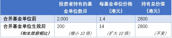 - 假设对现有 10 个基金单位进行合并,产品的已发行单位总数将会减少 10 倍,而每单位的价格将增加 10 倍,但投资者手中所持有单位的总价值不变。