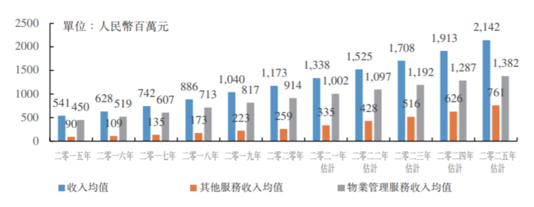 由于在管物业的建筑面积及数目增长,物业服务百强企业的平均收益由 2015 年的约人民币 5.408 亿元增至 2020 年的 11.73 亿元,复合年增长率约为 16.7%。