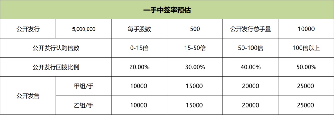 公开发行总计 500 万股,每手 500 股,公开发行总计 10000 手,当前超购 0.18 倍,假设 2000 人申购,一手中签率 100%。