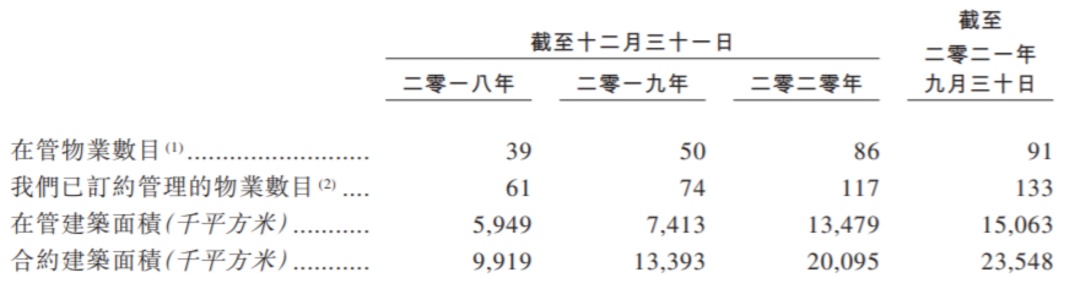 公司的在管建筑面积由 2018 年的 5.9 百万平方米增至 2019 年的 7.4 百万平方米、2020 年的 13.5 百万平方米及截至 2021 年 9 月 30 日的 15.1 百万平方米。
