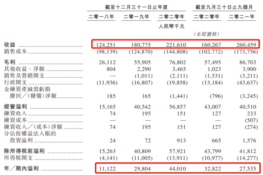 收益由 2018 年的人民币 1.243 亿元增至 2019 年的 1.808 亿元,并进一步增至 2020 年的 2.216 亿元,复合年增长率为 33.5%;由 2020 年 9 个月的 1.603 亿元增加 62.5% 至 2021 年同期的 2.605 亿元。