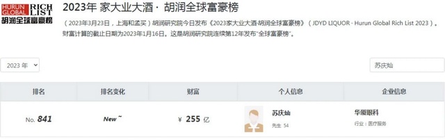 Su Qingcan, now under residential surveillance, is no small figure. With Huaxia Eye's listing, his net worth once reached 25.5 billion yuan. On the "2023 Hurun Global Rich List," Su Qingcan, the founder of Huaxia Eye, debuted at 841st place globally and third in Xiamen, with a net worth of 25.5 billion yuan, trailing only Ding Shizhong and Ding Shijia of Anta Group.