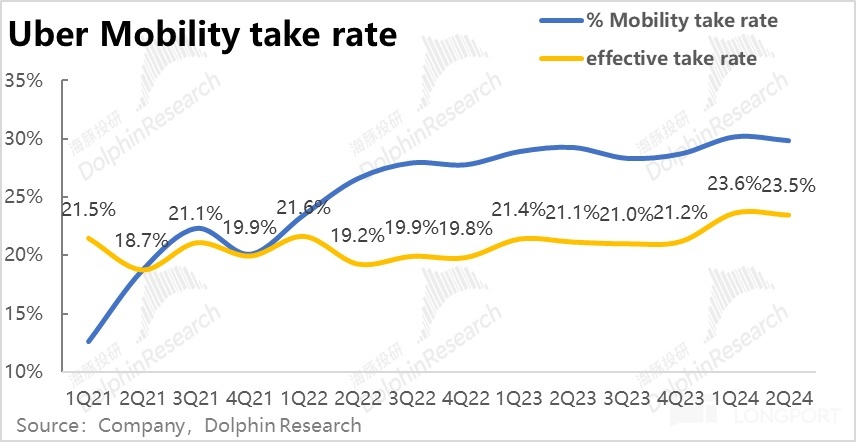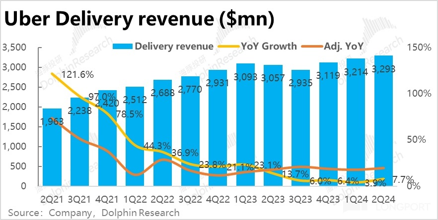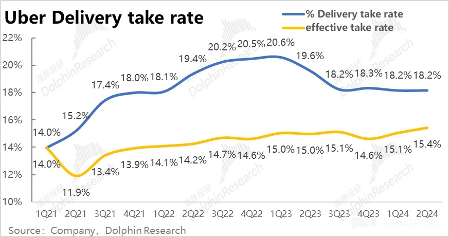 The revenue of the food delivery business was 3.29 billion, an 8% year-on-year growth, accelerating by 4 percentage points compared to the previous quarter. The accelerated revenue growth is mainly attributed to the comparable monetization rate (after excluding the impact of changes in criteria) increasing by 0.3 percentage points to 15.4% compared to the previous quarter. Dolphin Research believes that the increase in monetization rate is mainly due to the growth of Uber's advertising business. According to the company's disclosure, the current annualized revenue from advertising has reached $1 billion.