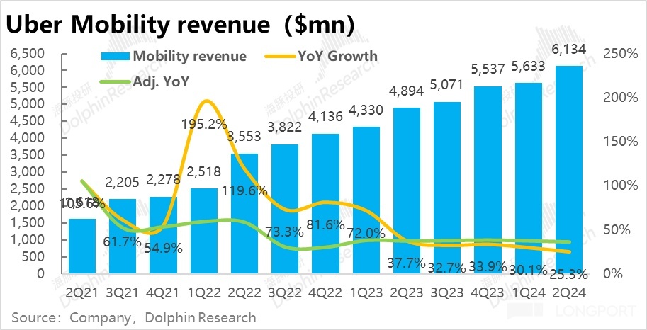 In terms of the key indicator reflecting the actual operating conditions, Gross Transaction Value (GTV), the cornerstone ride-hailing (Mobility) business recorded an order amount of approximately 20.6 billion this quarter, slightly exceeding expectations by 1%. The year-on-year growth rate is 22.9%, seemingly continuing to slow down by 1.7 percentage points compared to the previous quarter , but in reality, after excluding the drag from the appreciation of the U.S. dollar, the growth rate under constant exchange rates is 27%, showing an increase of 1 percentage point compared to the previous period.