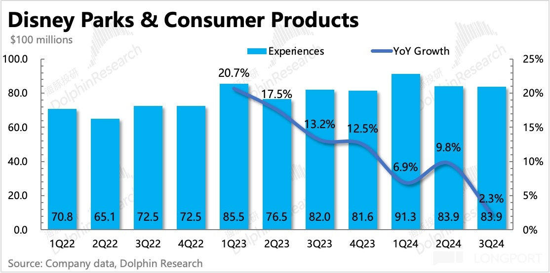 In the third quarter, revenue from theme parks and consumer products was 8.4 billion, a year-on-year increase of 2.3%, which is significantly slower than the previous quarter. Within the internal structure, the growth rate of the park business was 3.4%, while consumer products returned to a decline. Although there were expectations for the fading of the post-pandemic dividend, the visible speed of demand cooling is rapid.