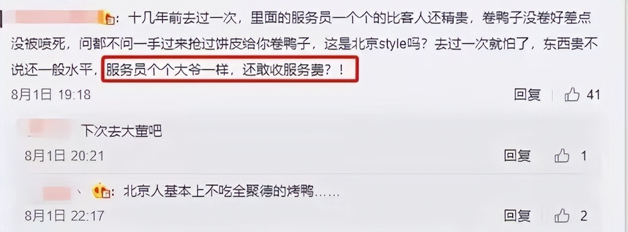 不仅如此,全聚德一个国企,还学起了欧洲餐厅收服务费的行为,然而每桌 10% 的服务费并未让顾客感受到 “物有所值”。