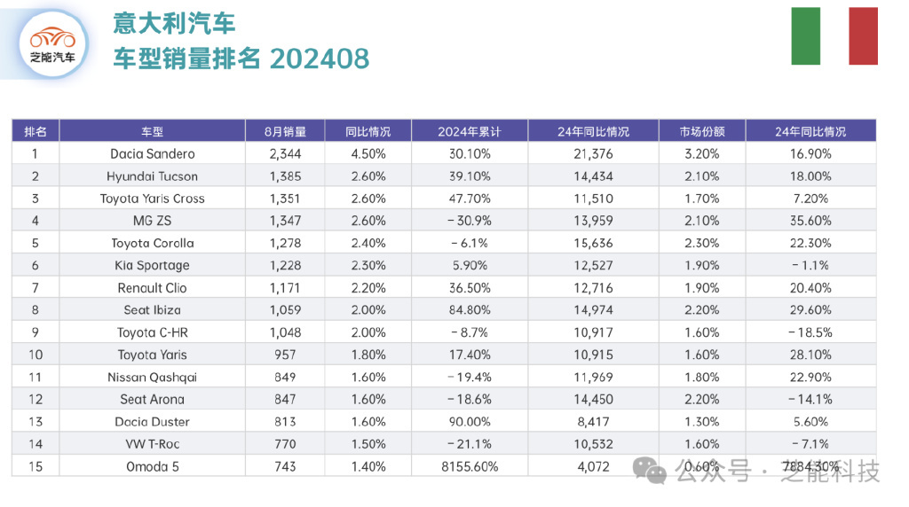 2024 年 8 月,意大利新车市场经历了显著的变动,整体销量同比下降 13.4% 至 69,121 辆,而且市场格局发生了前所未有的变化。