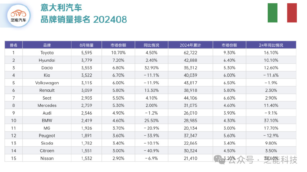 全球车市 | 8 月意大利汽车销量,丰田首次登顶