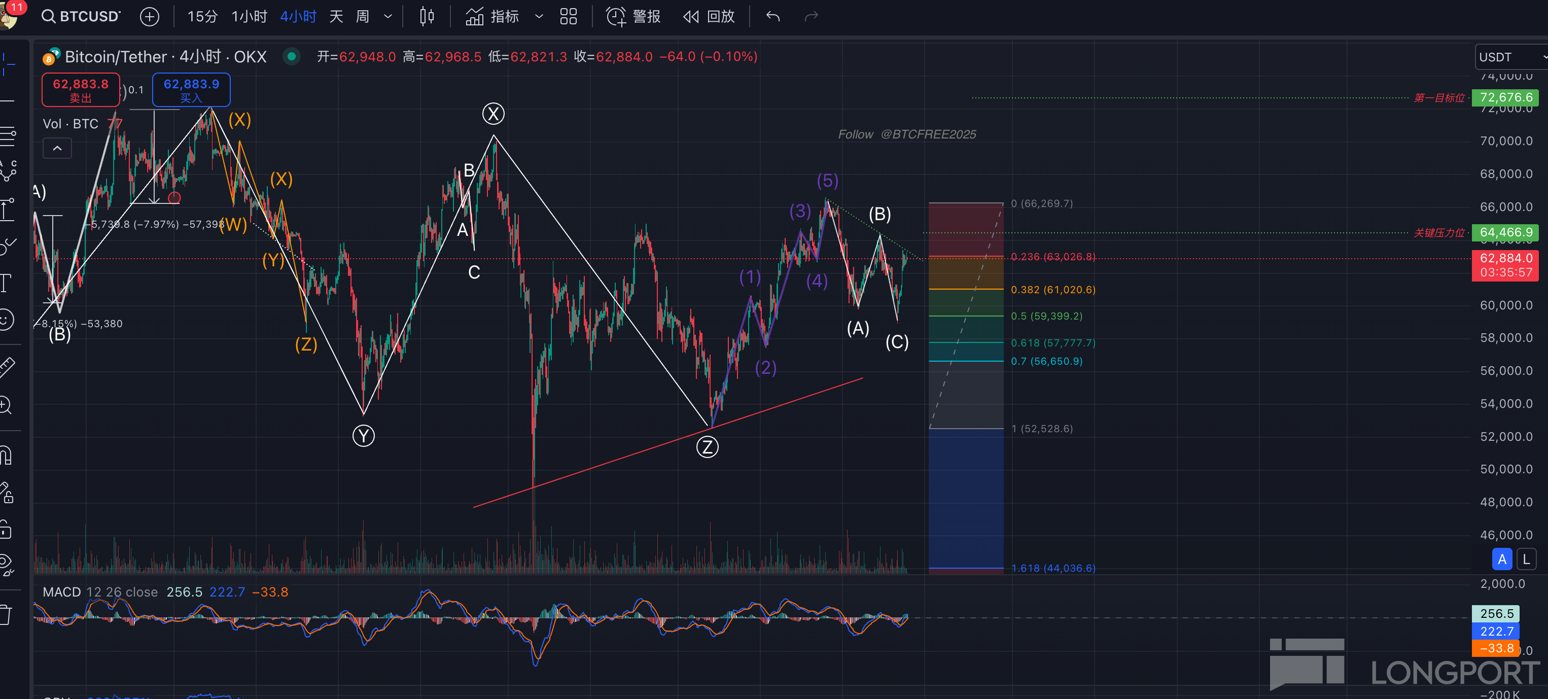Since the March peak of 73.7k, we believe Bitcoin has undergone a typical triple three-wave 横向调整 (lateral adjustment) (marked as wxyxz, with white 主浪线标注 in the chart). Based on the current trend, wave z likely concluded around 52.5k. Starting from 52.5k, a five-wave 上涨结构 (rising structure) has emerged, numbered 12345 (marked with purple lines in the chart), followed by a typical ABC 锯齿型调整 (zigzag adjustment) (marked with white lines in the chart). 58.9k is highly likely to be the end of this adjustment, and Bitcoin has a high probability of entering the next 上涨推动浪 (rising impulse wave). Starting to feel excited?