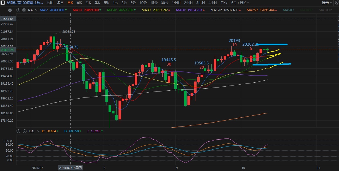 Last week's U.S. non-farm payroll data unexpectedly smashed expectations (the data looks fishy!). The Nasdaq took the chance to break upward, but the move was modest and hasn't surpassed previous highs. After the latest CPI inflation data this week, the probability of a 25bps Fed rate cut at the next meeting rose again. The index has been hovering around 20400 for the past two days, temporarily avoiding the risk of breaking below 19850.