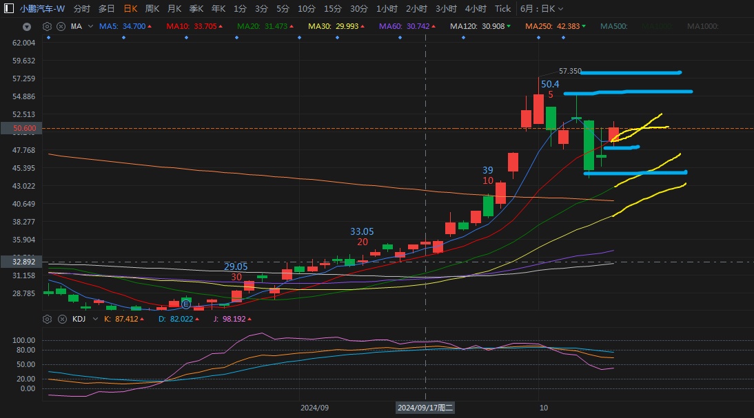Among the "three fools," XPeng, while not yet in a full reversal from a macro perspective, has already slightly outperformed the broader market and other heavyweights in the short term, with MA5 forming a golden cross with MA10. Resistance is at HKD 55 and 57, with support at HKD 48. A break below 48 would signal range-bound trading, with major support at HKD 44.5 next week. $XPENG-W(09868.HK)