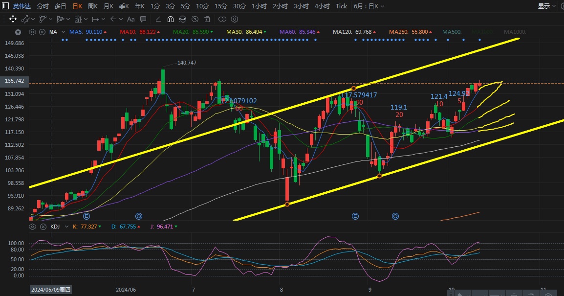 Nvidia gained nearly 8% this week, nearing previous highs. It's currently in a wave-like uptrend, with solid support at $130, $124, and $122. Resistance is at $140. $NVIDIA(NVDA.US)