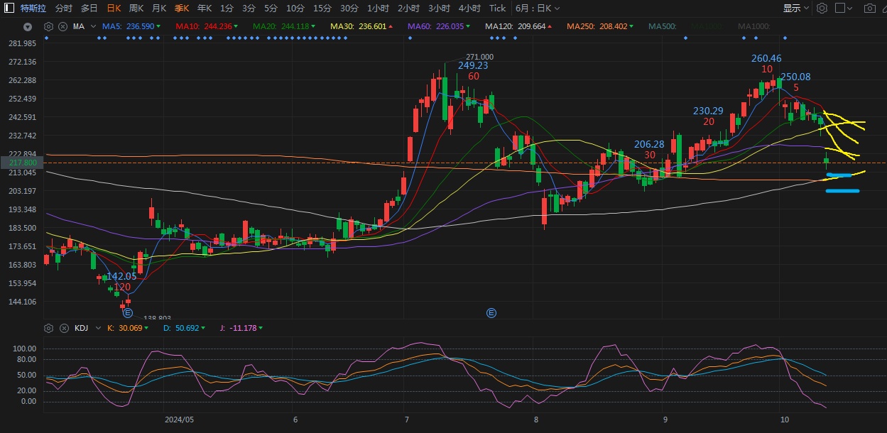 Another highlight this week was Tesla's Robotaxi unveiling. The two scissor-door, steering-wheel-less, button-less Robotaxis were undeniably cool, along with the 20-seater Robovan. The upgraded Optimus, which can dance, mix drinks, and play rock-paper-scissors, was the finale. There were plenty of highlights, but no detailed specs or commercialization plans. Elon Musk was 30 minutes late, and the entire 20-minute event left investors unimpressed. Tesla's pre-market dropped 7%, closing down 8.78% for the day. Support at $210 and $203, with 5-day MA resistance at $232. Time is needed for recovery. $Tesla(TSLA.US)