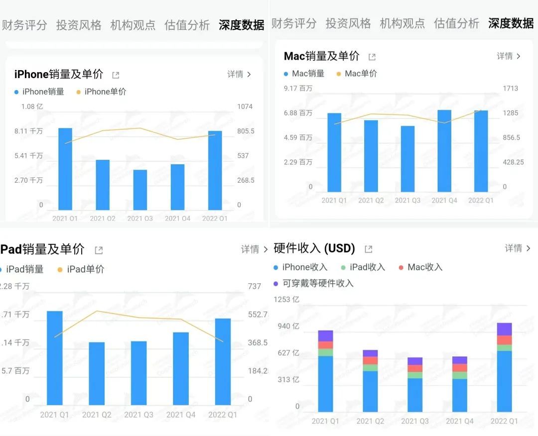 iphone 系列、Mac 销量、ipad 的销量统计。通过苹果的深度数据我们可以清晰看到苹果的硬件收入包括 iphone 系列、Mac 销量、ipad 的销量及单价等一系列数据统计方便大家更加了解苹果的销售情况。