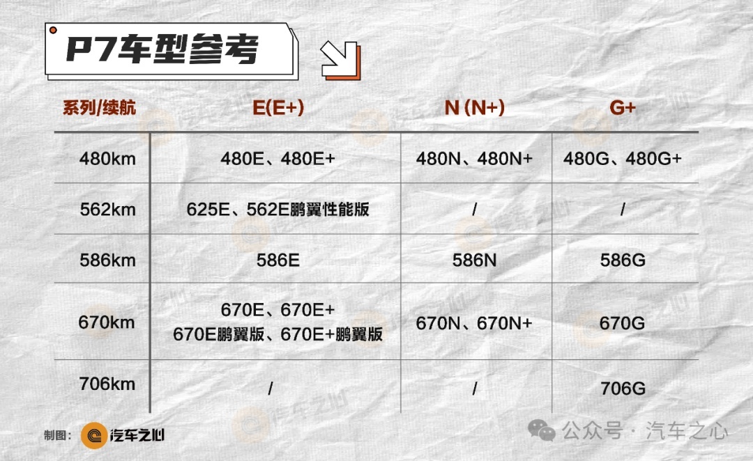 2022 年,小鹏 P7 根据续航和车辆特性来划分版本,数字加字母的组合下来,最多有 20 个版本,少了重点反而让人眼花缭乱。