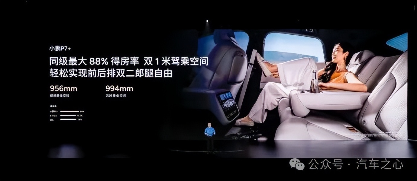 过去 20 万级别的轿车对后排空间释放得不够彻底,小鹏 P7+ 就把空间作为最大的卖点,突出后排使用空间。P7+ 后排乘坐空间 994mm,前后排都接近双一米空间。