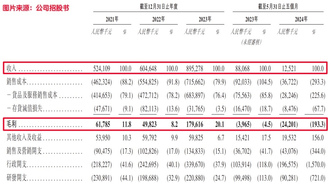 Revenue: The company achieved revenues of RMB 524 million, RMB 605 million, and RMB 895 million in 2021, 2022, and 2023, respectively, with a compound annual growth rate (CAGR) of 30.69%. However, revenue for the first five months of 2024 plummeted by 85.7% year-on-year to only RMB 13 million. While the growth from 2021 to 2023 was relatively strong, the sharp decline in 2024 is primarily attributed to seasonal factors and fluctuations in customer demand for fuel cell systems and components due to their vehicle production plans.