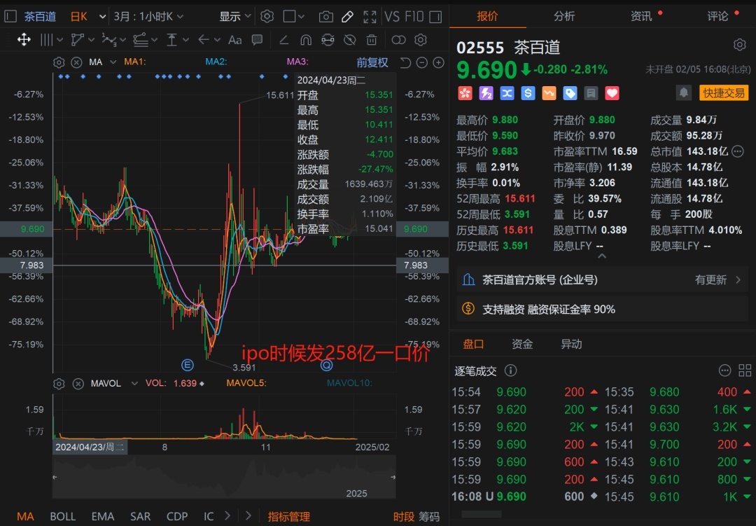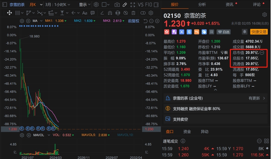 茶百道的跌幅也一度超过 70%,还好后续股价有所回升,但跌幅仍超过 40%。奈雪的茶在港股上市至今的跌幅已超过 90%,奈雪现在跌得只剩下 20 亿了。之前两个上市的茶饮股都表现不佳。