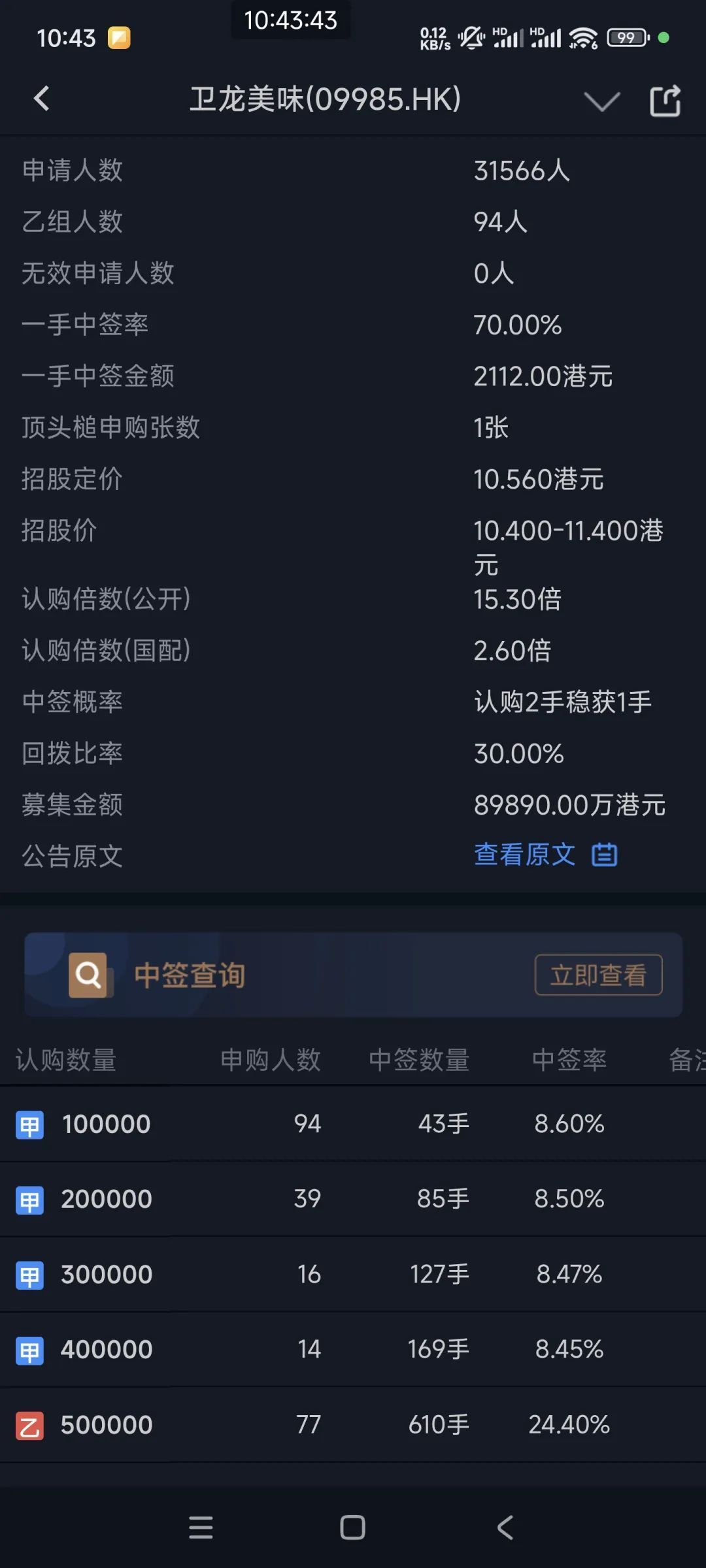 关于一手中签率方面,如果孖展在 15 倍以上,按照 4 人来参与预估一下,一手中签率 90%,融资打新的话中签率可以参考之前卫龙辣条, 卫龙也是 15 倍刚刚好回拨,估计古茗这次有可能也是回拨 30%,不过古茗的募资规模比卫龙大了 1/2,从目前的孖展倍数来看,乙组中签率可能会很高。