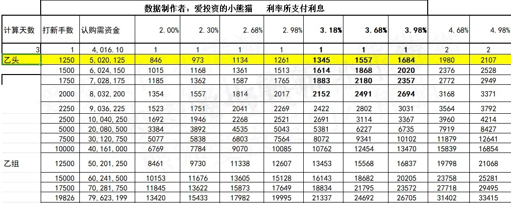 乙组的各档融资所需要的本金还有融资金额对应如下表: