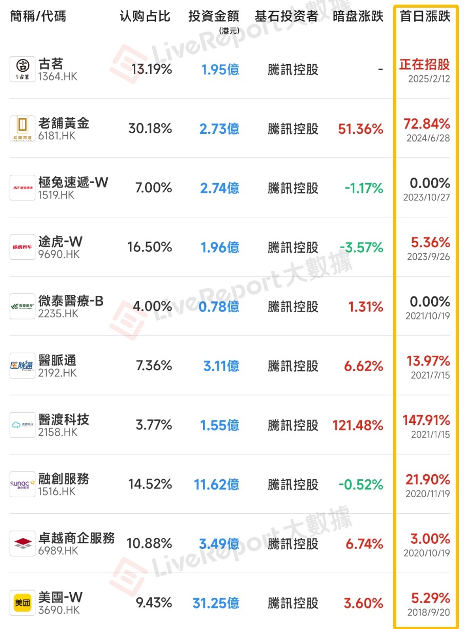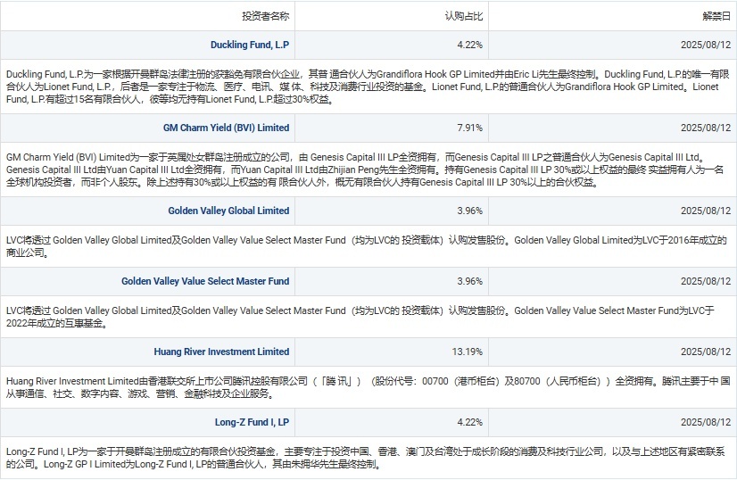 由腾讯控股全资拥有的 Huang River Investment Limited,认购 2500 万美元(约 1.95 亿港元),约占全球发售股份的 13.19%(按发行价中位数计,假设超额配股权未获行使);