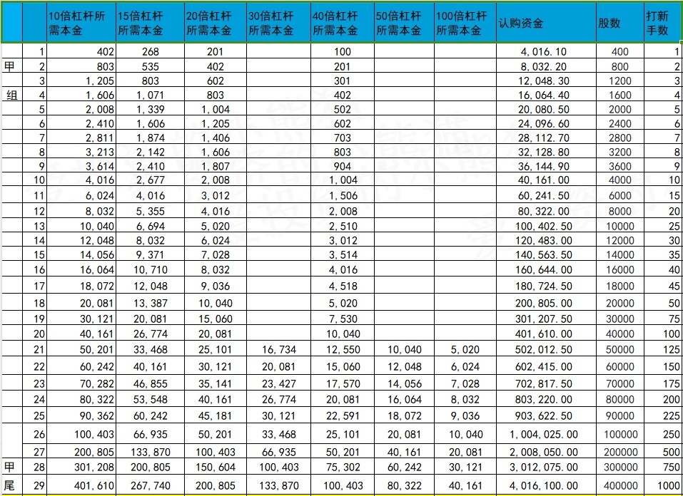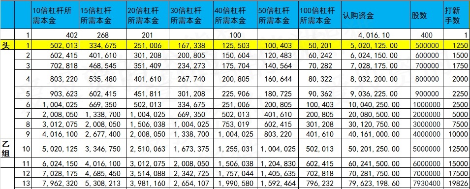甲组的各档融资所需要的本金还有融资金额对应如下表: